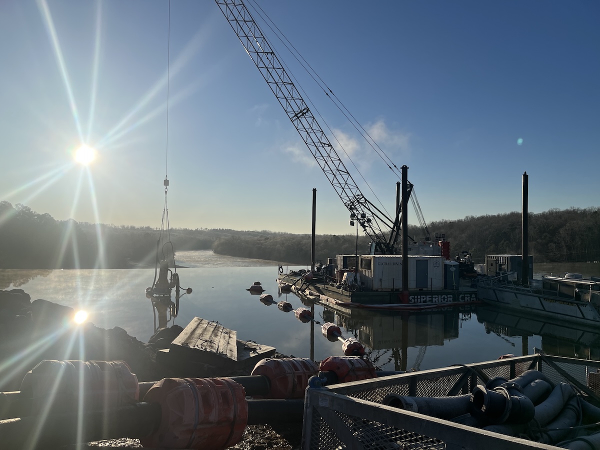 The scope included hydraulic dredging of approximately 12,000 cubic yards of sediment and debris to restore reservoir function, water flow, and intake efficiency. A mobile sand processing plant was operated on-site to process dredged material and produce aggregate used for coal ash cap remediation, supporting compliant closure activities in accordance with environmental regulations.