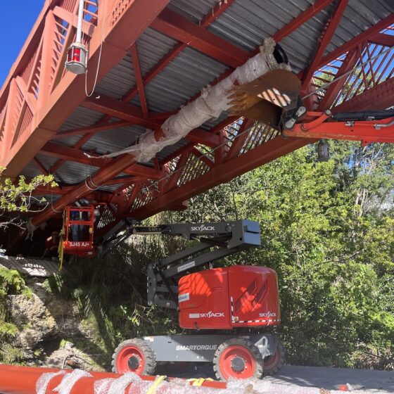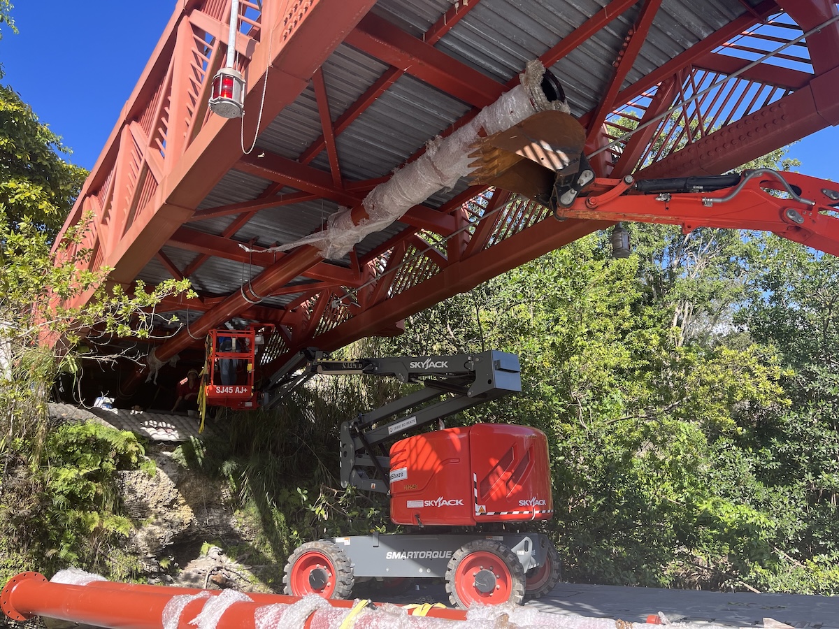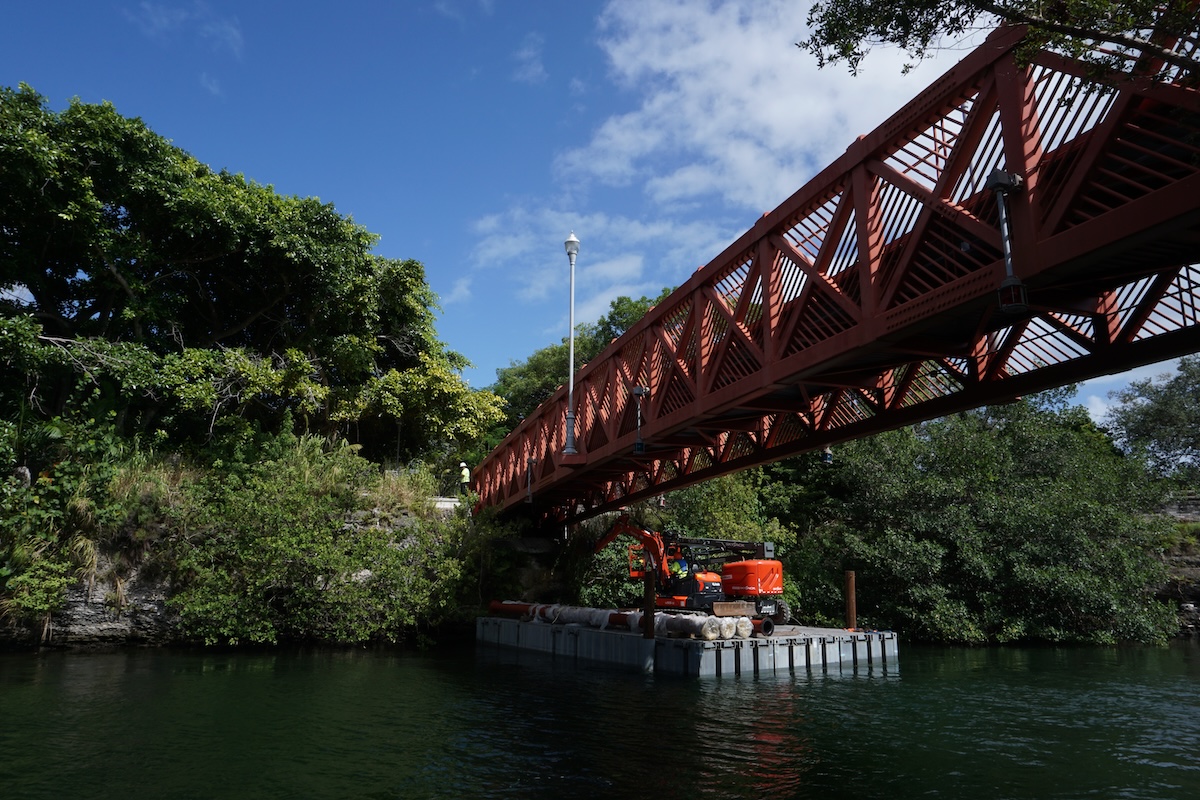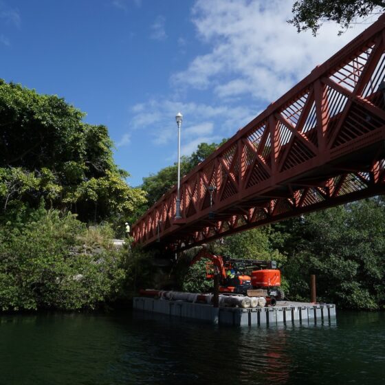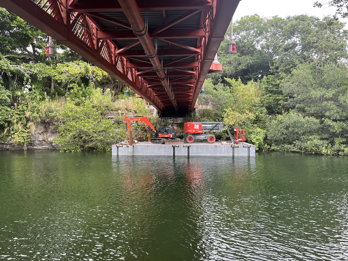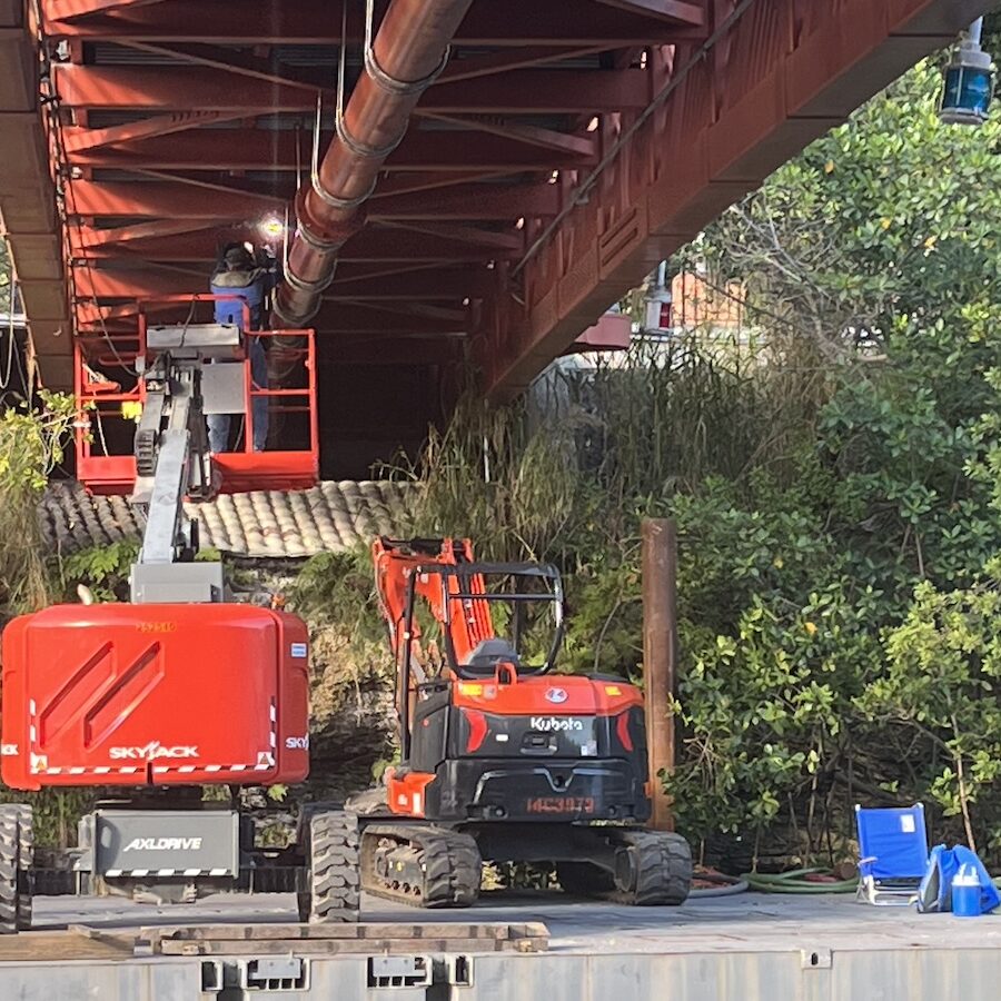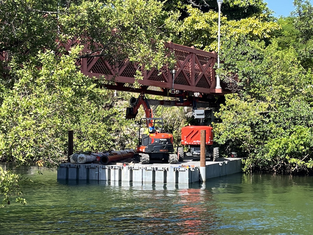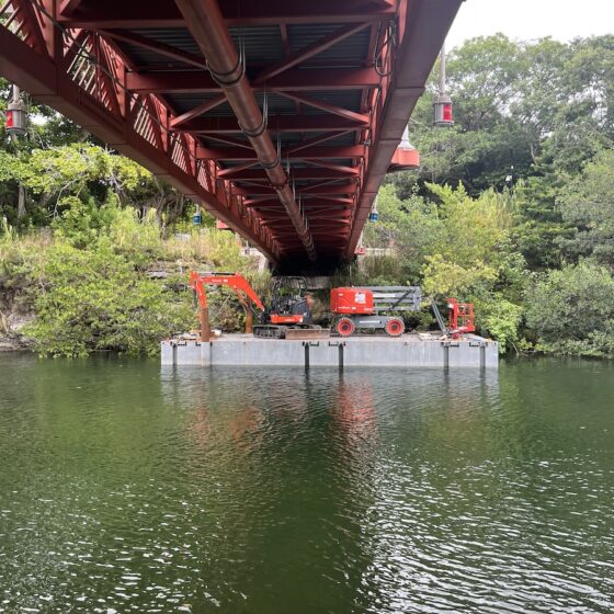 The scope included barge-supported installation of the force main beneath pedestrian bridge crossings, allowing construction activities to proceed while minimizing disruption to public access and maintaining structural integrity. Following installation, system commissioning was completed to verify operational performance, pressure integrity, and full integration with the existing sanitary sewer network.